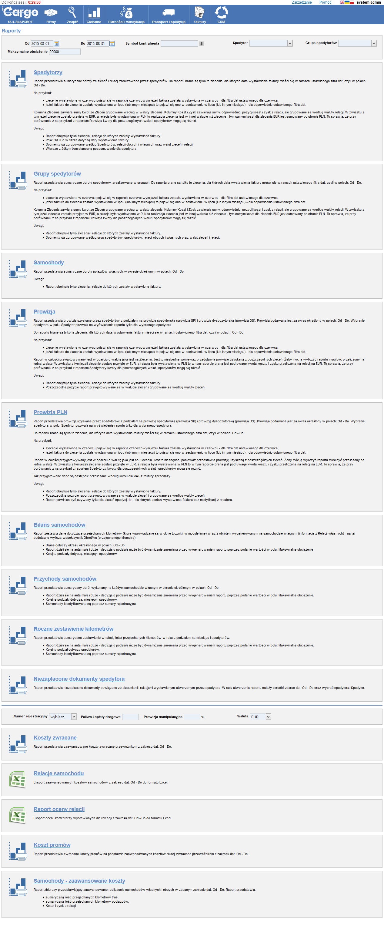Dotyczą spedytorów, bilansów pojazdów, zaawansowanych kosztów zleceń i relacji.