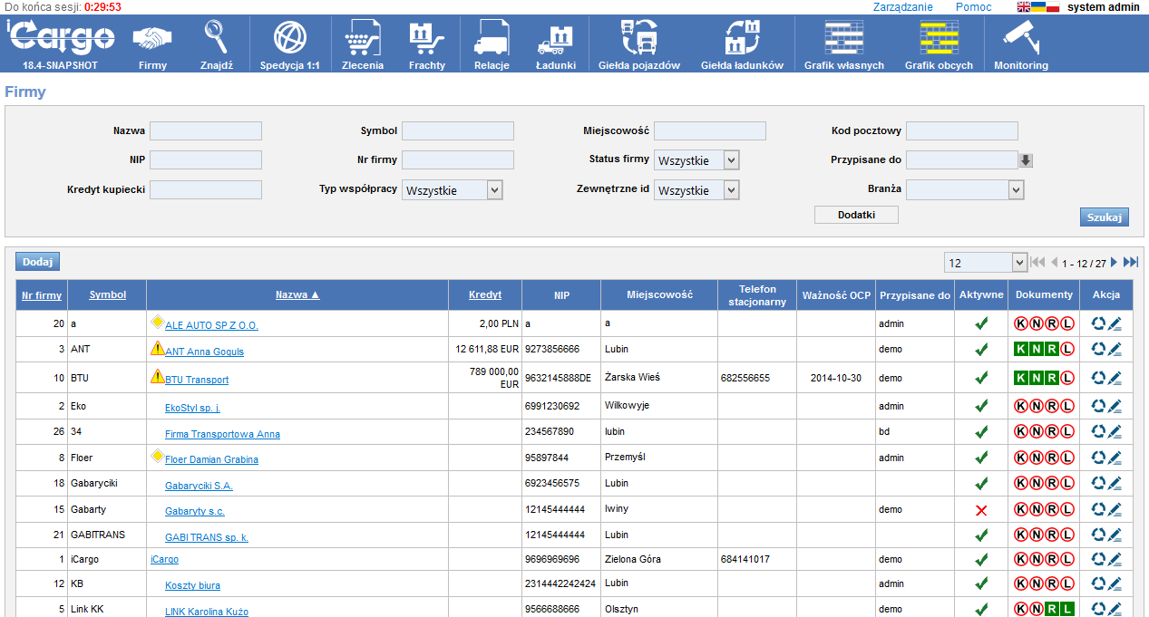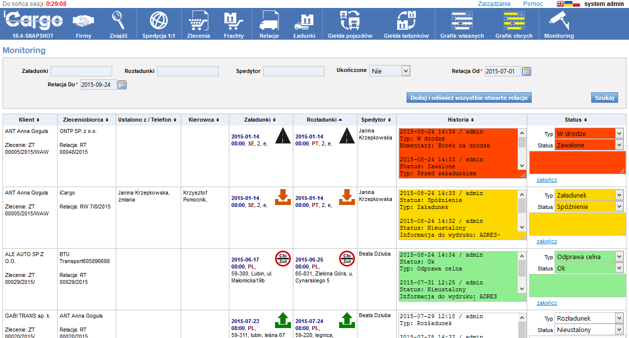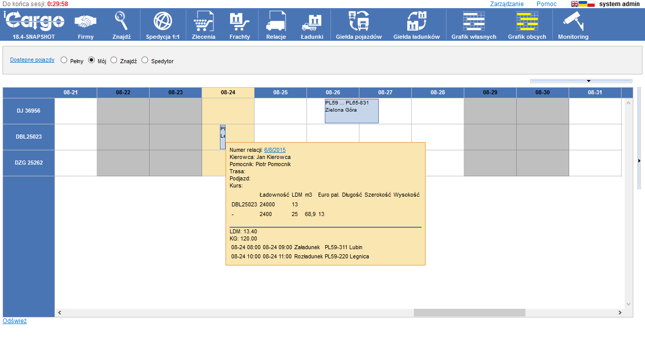 - Monitoring i Grafiki: Zastąp tablice i arkusze Excel. Relacje są automatycznie widoczne w Grafiku własnych i Grafiku obcych. Monitoring pozwala na obserwację ładunku w zakresie jego statusu i terminowości.