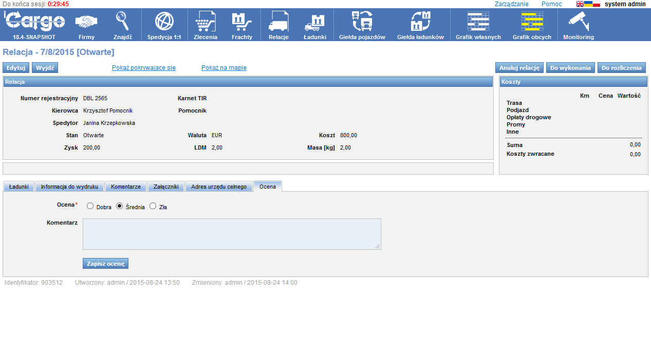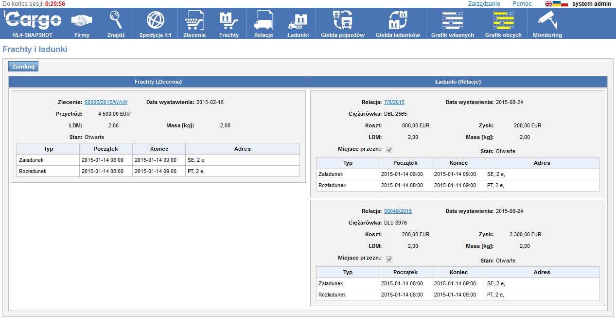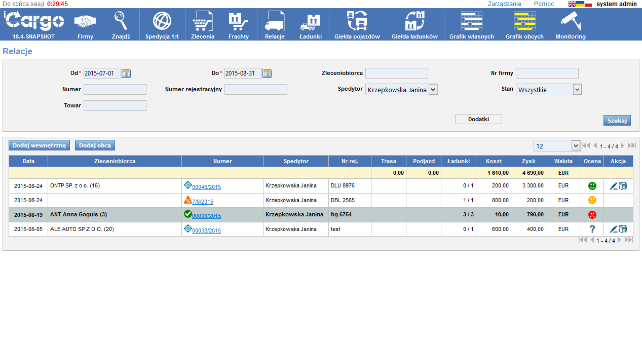 - Relacje: Są to wystawione przez nas „zlecenia” dla własnych pojazdów (Relacja na pojeździe własnym) lub sprzedane dla podwykonawców (Relacja na pojeździe obcym).