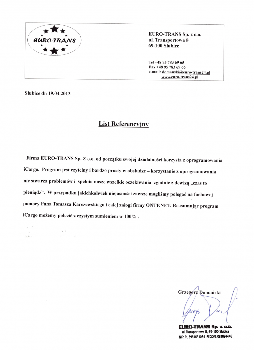 “Szczerze polecam program iCargo. Jest bardzo intuicyjny i nieskomplikowany. Posiada wiele sprytnych udogodnień. Program daje sobie nawet radę ze zleceniami bardzo rozbudowanymi – kilka aut w jednym zleceniu. Przy tym wszystkim jest niedrogi, a obsługa ….no właśnie…. ! Biuro obsługi klienta zawsze miłe i zawsze cierpliwe – tłumaczy do pełnego zrozumienia. Na pomoc można liczyć zawsze, więc nie są Państwo pozostawieni sami sobie. Do tego zespół programistów chętnie przyjmuje nowe pomysły i innowacje. Szuka dogodnych rozwiązań, tak żeby każdemu pracowało się dobrze i wygodnie.”