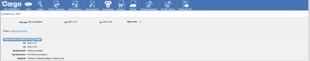 Eksportu danych do programów finansowo-księgowych dokonujemy w module Faktury → Ewidencja VAT. W oknie wybieramy odpowiednie dla nas dane.