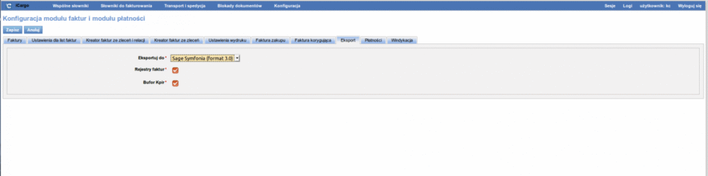 W celu konfiguracji iCargo do współpracy z Sage Symfonia, należy wejść w Zarządzanie → Konfiguracja → Konfiguracja modułu faktur i modułu płatności.