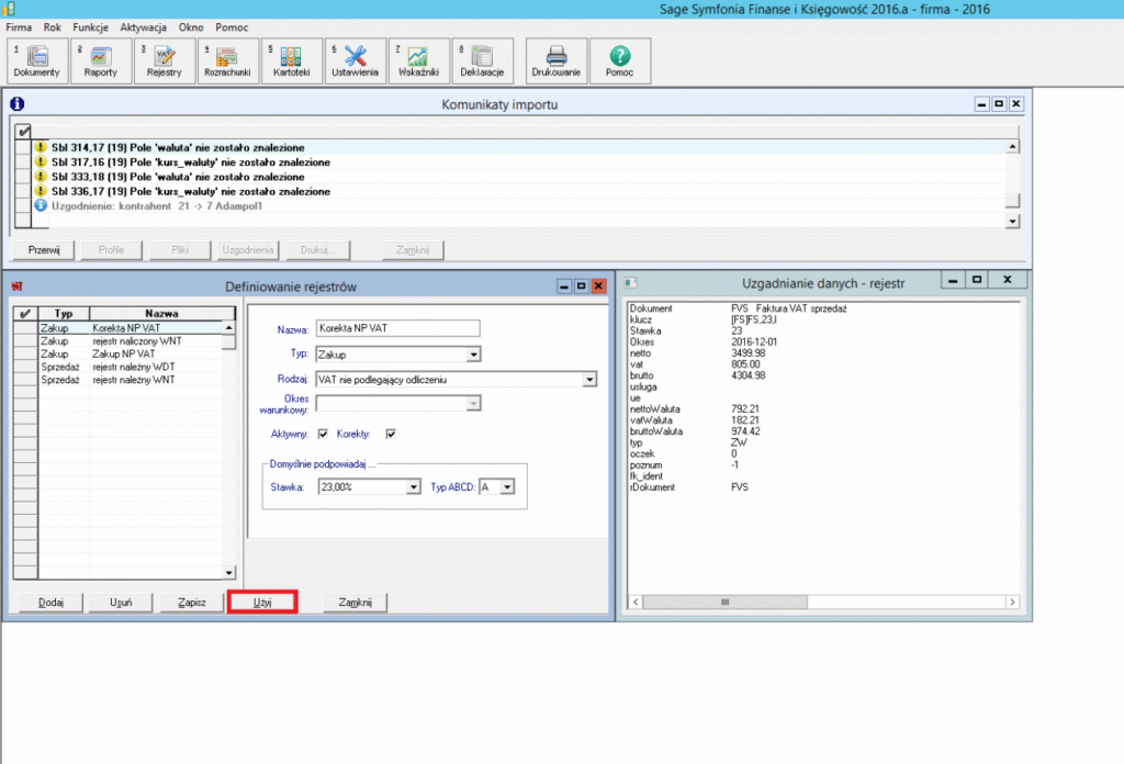 Po zapisaniu kontrahentów trzeba jeszcze zdefiniować rejestry (w tym przypadku były to faktury sprzedaży, dlatego takie też wybrano) i zatwierdzić je przyciskiem Użyj.