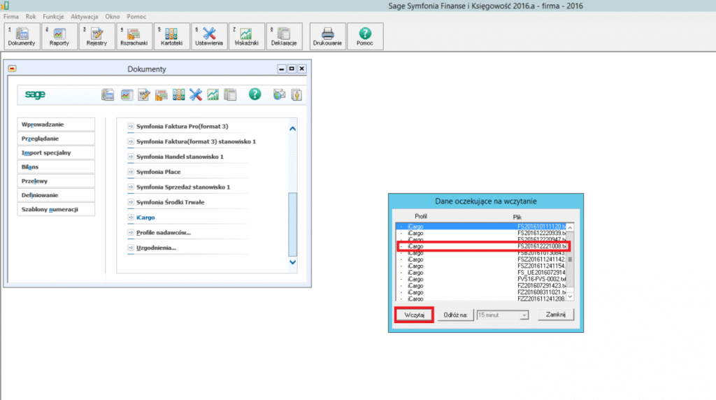 Teraz, żeby zaimportować faktury do Sage FK, należy wybrać Dokumenty → Import specjalny → i wybrać szablon iCargo.