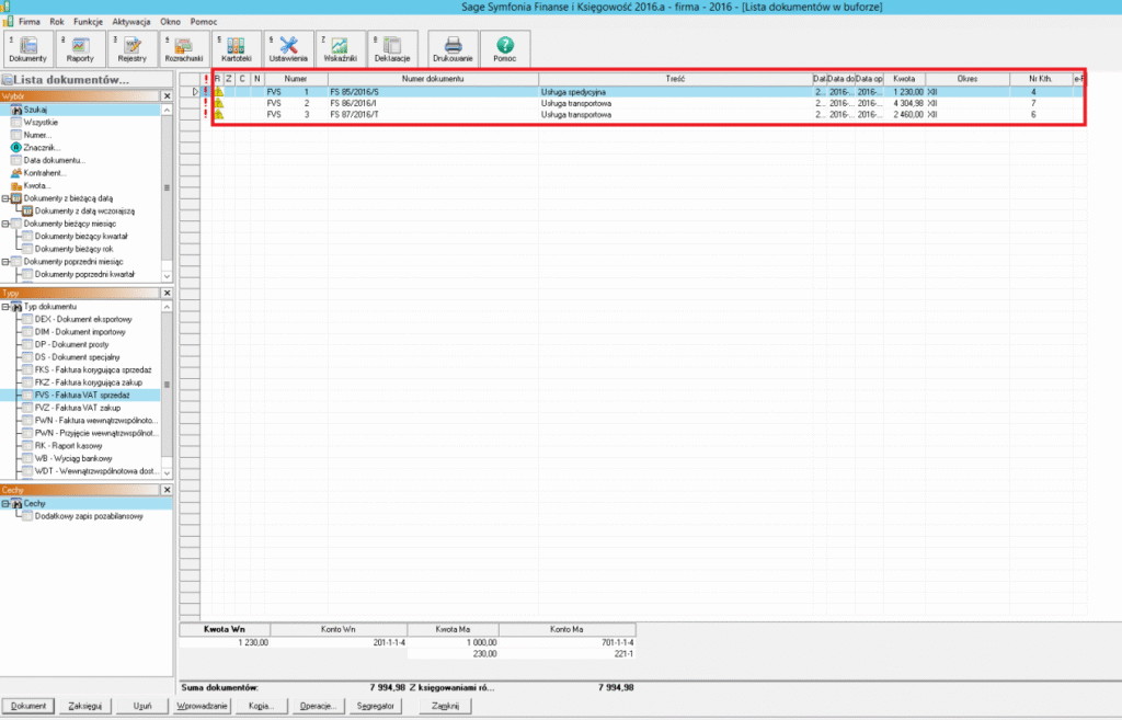 Następnie w liście dokumentów wybieramy interesujący nas typ (w tym przypadku był to FVS – Faktura VAT sprzedaż) i tu można sprawdzić zaimportowane faktury.