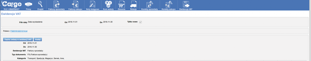 Eksportu danych do programów finansowo-księgowych dokonujemy w module Faktury → Ewidencja VAT. W oknie wybieramy odpowiednie dla nas dane.