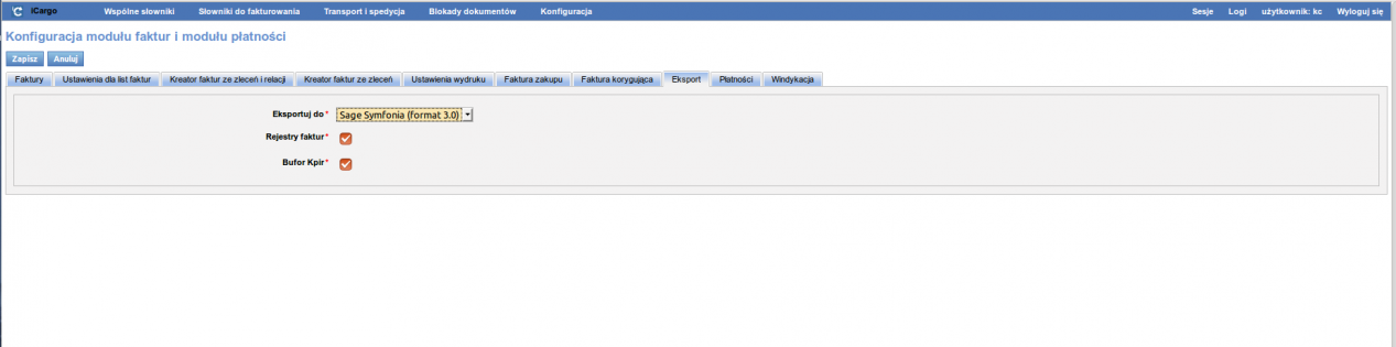W celu konfiguracji iCargo do współpracy z Sage Symfonia, należy wejść w Zarządzanie → Konfiguracja → Konfiguracja modułu faktur i modułu płatności.
