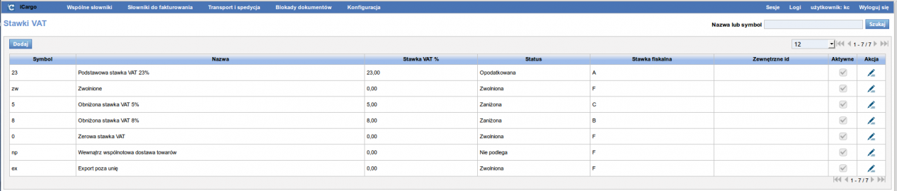 Następnie niezbędne jest skonfigurowanie stawek fiskalnych. Stawki fiskalne można ustawić po przejściu w Zarządzanie → Słowniki do fakturowania → Stawki VAT.