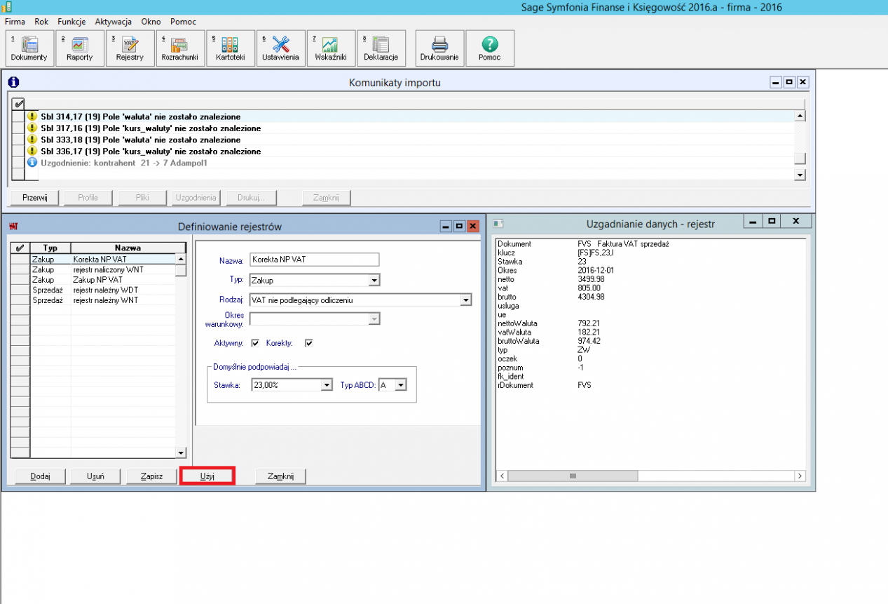 Po zapisaniu kontrahentów trzeba jeszcze zdefiniować rejestry (w tym przypadku były to faktury sprzedaży, dlatego takie też wybrano) i zatwierdzić je przyciskiem Użyj.