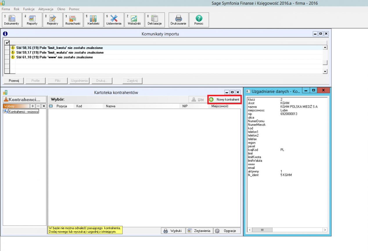 Następnie dodać trzeba nowego kontrahenta, jeżeli jeszcze nie mamy go w systemie, poprzez kliknięcie ikony Nowy kontrahent, a następnie, po sprawdzeniu czy wszystkie dane się zgadzają, Zapisz.