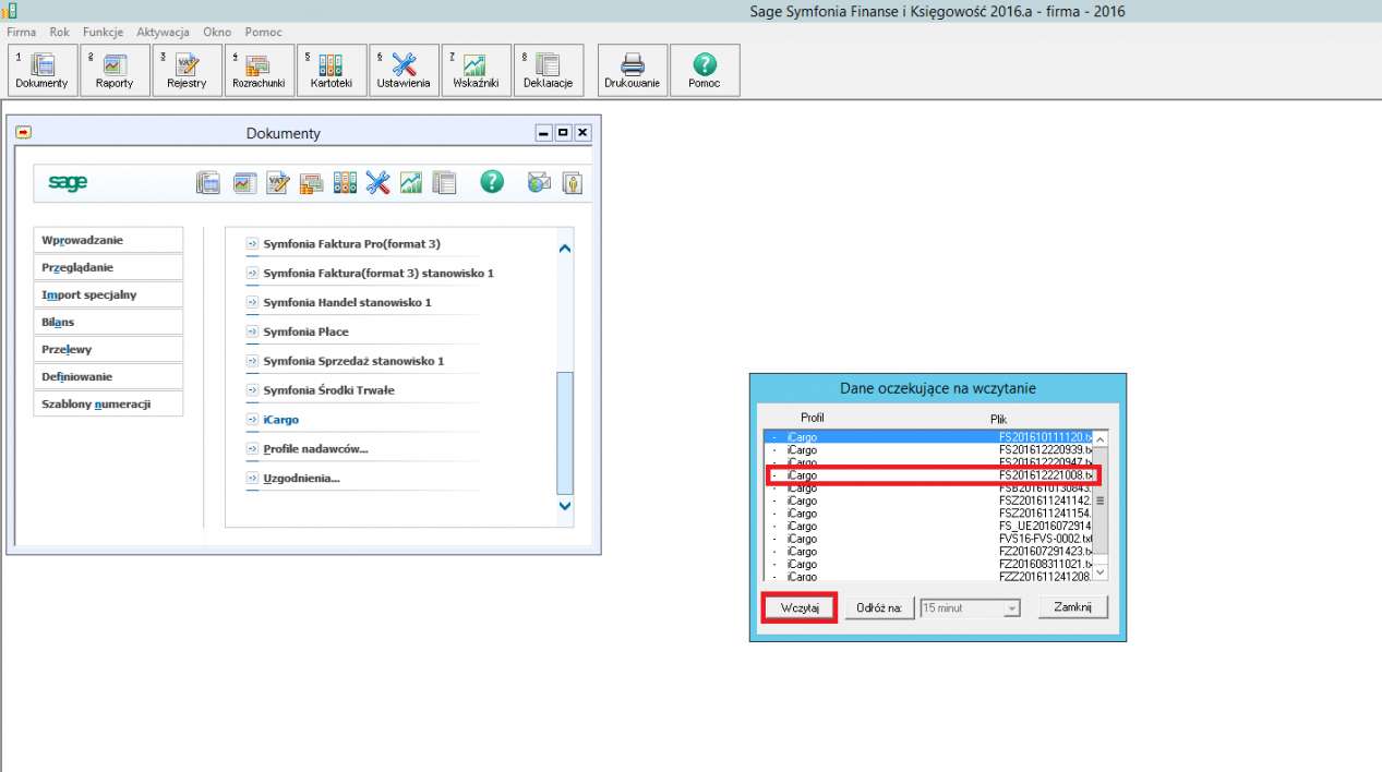 Teraz, żeby zaimportować faktury do Sage FK, należy wybrać Dokumenty → Import specjalny → i wybrać szablon iCargo.