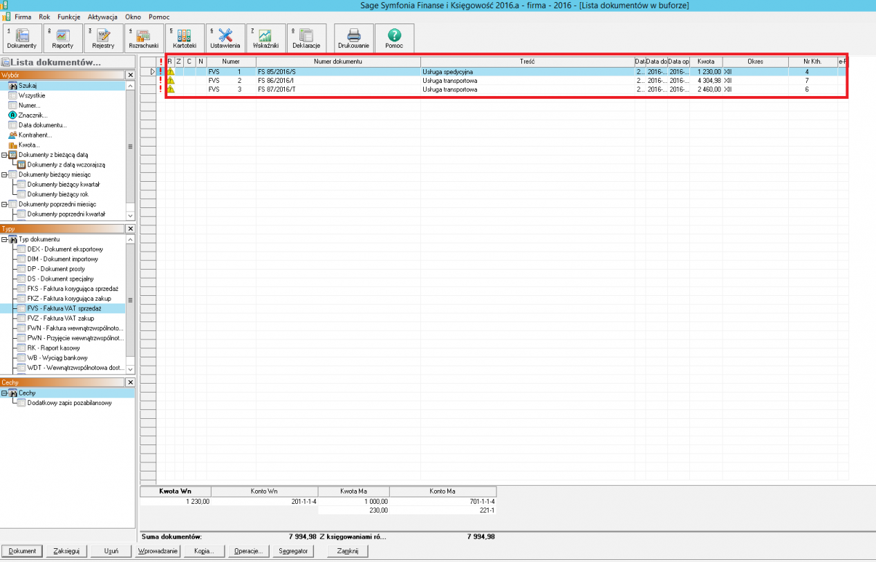 Następnie w liście dokumentów wybieramy interesujący nas typ (w tym przypadku był to FVS – Faktura VAT sprzedaż) i tu można sprawdzić zaimportowane faktury.
