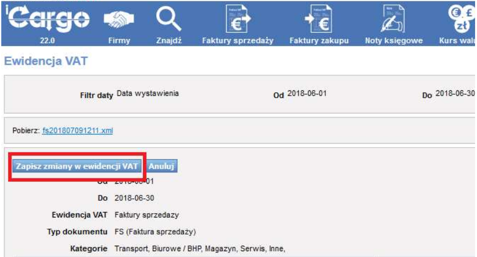 - Oznaczyć faktury jako wyeksportowane – można to wykonać poprzez kliknięcie „Zapisz zmiany w ewidencji VAT”