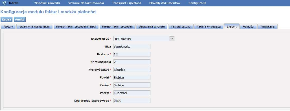 W celu konfiguracji eksportu pliku JPK_FA należy wejść w okno Zarządzanie → Konfiguracja → Konfiguracja modułu faktur i modułu płatności.